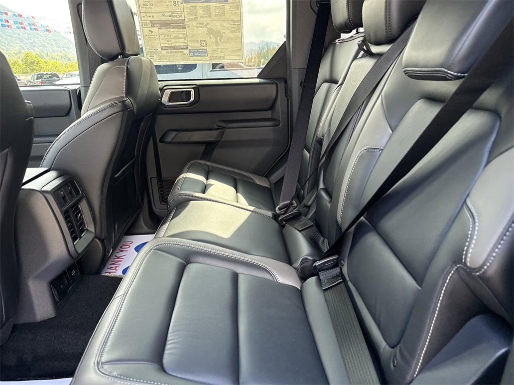 Equipment Group 312A Mid Package, Sasquatch Package (High Clearance Fender Flares, High Clearance Suspension, Position-Sensitive Bilstein Shock Absorbers, and Wheels: 17 Carbonized Gray Painted Aluminum), 18 Bright Machined Aluminum Wheels, 4-Wheel Disc Brakes, 7 Speakers, ABS brakes, Air Conditioning, Alloy wheels, AM/FM radio: SiriusXM with 360L, AM/FM Stereo, Auto High-beam Headlights, Auto-dimming Rear-View mirror, Automatic temperature control, Brake assist, Compass, Connected Navigation, Delay-off headlights, Driver door bin, Driver vanity mirror, Dual front impact airbags, Dual front side impact airbags, Electronic Stability Control, Emergency communication system: 911 Assist, Exterior Parking Camera Rear, Front anti-roll bar, Front Bucket Seats, Front Center Armrest, Front dual zone A/C, Front fog lights, Front reading lights, Front wheel independent suspension, Fully automatic headlights, Heated door mirrors, Heated front seats, Heated Leather-Trimmed/Vinyl Bucket Seats, Heated steering wheel, Illuminated entry, Integrated roll-over protection, Internet access capable: FordPass Connect, Leather Shift Knob, Low tire pressure warning, Navigation system: Connected Navigation, Occupant sensing airbag, Outside temperature display, Overhead airbag, Overhead console, Panic alarm, Passenger door bin, Passenger vanity mirror, Power door mirrors, Power driver seat, Power passenger seat, Power steering, Power windows, Radio data system, Rear seat center armrest, Remote keyless entry, Security system, SiriusXM w/360L, Speed control, Split folding rear seat, Steering wheel mounted audio controls, SYNC 4, Tachometer, Telescoping steering wheel, Tilt steering wheel, Traction control, Trip computer, Upgraded Carpet Floor Mats, Variably intermittent wipers, Voltmeter, and Wheels: 17 Black High Gloss-Painted Aluminum (64X)