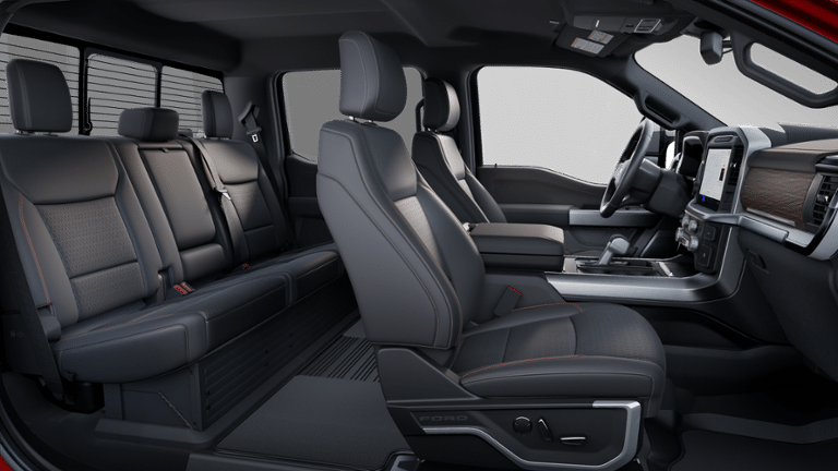 Equipment Group 502A High (Wheels: 20 Chrome-Like PVD), FX4 Off-Road Package (4x4 FX4 Off-Road Bodyside Decal, Hill Descent Control, Monotube Rear Shocks, Off-Road Tuned Front Shock Absorbers, Rock Crawl Mode, and Tray Style Floor Liner w/o Carpet Mats), Tow/Haul Package, 4-Wheel Disc Brakes, 8 Speakers, ABS brakes, ActiveX Trimmed Bucket Seats, Adjustable pedals, Air Conditioning, Alloy wheels, AM/FM radio: SiriusXM with 360L, Auto High-beam Headlights, Auto-dimming door mirrors, Auto-dimming Rear-View mirror, Automatic temperature control, Brake assist, Bumpers: chrome, Chrome wheels, Compass, Delay-off headlights, Driver door bin, Driver vanity mirror, Dual front impact airbags, Dual front side impact airbags, Electronic Stability Control, Emergency communication system: SYNC 4 911 Assist, Front anti-roll bar, Front Bucket Seats, Front Center Armrest, Front dual zone A/C, Front fog lights, Front License Plate Bracket, Front reading lights, Front wheel independent suspension, Fully automatic headlights, Garage door transmitter, Heated door mirrors, Heated front seats, Heated steering wheel, Illuminated entry, Internet access capable: FordPass Connect 5G, Low tire pressure warning, Memory seat, Navigation system: Connected Navigation, Occupant sensing airbag, Outside temperature display, Overhead airbag, Overhead console, Panic alarm, Passenger door bin, Passenger vanity mirror, Pedal memory, Power door mirrors, Power driver seat, Power passenger seat, Power steering, Power Telescoping/Glass/Folding Trailer Tow Mirrors, Power windows, Radio data system, Radio: B&O Sound System by Bang & Olufsen, Rain sensing wipers, Rear reading lights, Rear seat center armrest, Rear step bumper, Rear window defroster, Remote keyless entry, Security system, Speed control, Split folding rear seat, Steering wheel mounted audio controls, SYNC 4 w/Enhanced Voice Recognition, Tachometer, Telescoping steering wheel, Tilt steering wheel, Traction control, Trip computer, Turn signal indicator mirrors, Variably intermittent wipers, Ventilated front seats, Voltmeter, and Wheels: 18 Chrome-Like PVD.